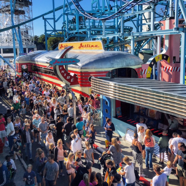 Plan B var att ge sig över till barnsektionen och bränna av några karuseller där. Köer. Köer. Köer. Barnen började resonera som så att om de åkte några av de tråkigare karusellerna, det vill säga dem de egentligen inte ville åka så var kötiden kortare. Knappast inte obefintlig, men heller inte lika lång. För det är ju en kul kompromiss att behöva göra på sin efterlängtade dag. Att välja bort det roligaste. I snitt köade vi minst 40 minuter per åk, i miljöer som bara inte är anpassade för den typen av köer. Till både Lustiga Huset och Blå Tåget ringlade sig köerna långt ner mot “strandpromenaden” och övriga bredde sig mest ut i parken.